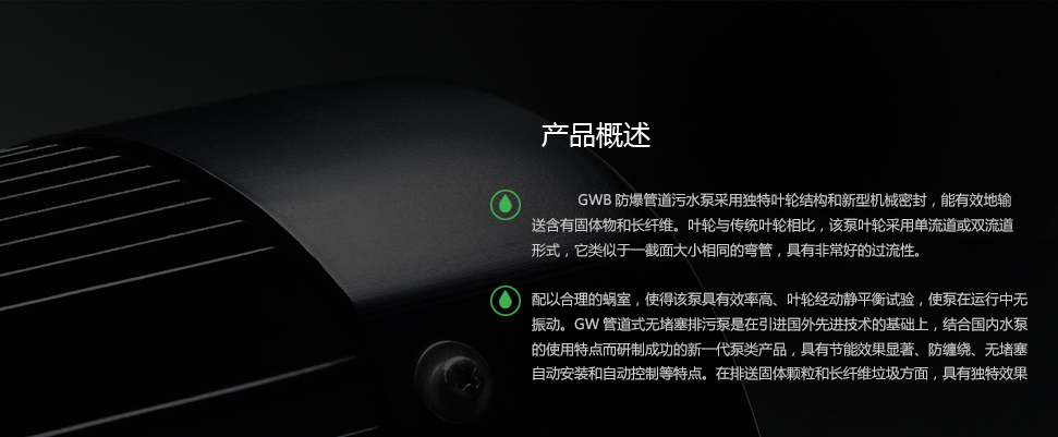GWB防爆電機管道泵是在引進國外先進技術的基礎上,結合國內水泵的使用特點而研制成功的新一代泵類產品,具有節能效果顯著、防纏繞、無堵塞、自動安裝和自動控制等特點。在排送固體顆粒和長纖維垃圾方面,具有獨特效果。