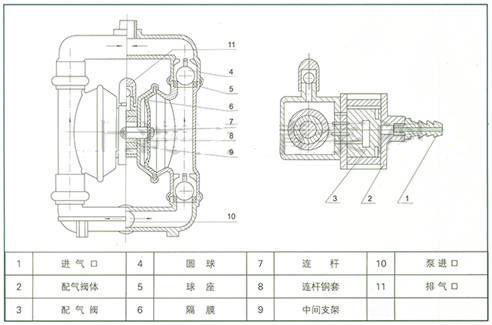1、QBY第三代工程塑料隔膜泵的兩個(gè)對(duì)稱各種腔中,各裝有一塊有彈性的隔膜6,聯(lián)桿7將兩塊隔膜結(jié)成一體,壓縮空氣從泵的進(jìn)氣接頭1進(jìn)入配氣閥3后,推動(dòng)兩個(gè)工作腔內(nèi)的隔膜,驅(qū)使聯(lián)桿聯(lián)接的兩塊隔膜同步運(yùn)動(dòng)。與此同時(shí),另一工作腔中的氣體則從其隔膜的背后排出泵外;一旦到達(dá)行程終點(diǎn),配氣機(jī)構(gòu)則自動(dòng)地將壓縮空氣引入另一工作腔,推動(dòng)隔膜朝相反方向運(yùn)動(dòng),這樣就形成了兩個(gè)隔膜的同步往復(fù)運(yùn)動(dòng)。每個(gè)工作腔中又設(shè)置有兩個(gè)單向球閥4,隔膜的往復(fù)運(yùn)動(dòng),造成工作腔內(nèi)容積的改變,迫使兩個(gè)單向球閥交替地開(kāi)啟和關(guān)閉,從而將液體連續(xù)地吸入和排出。