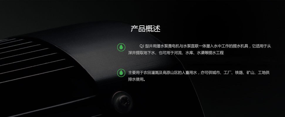 1.QJ型深井潛水泵機(jī)組由:水泵、潛水電機(jī)(包括電纜)、輸水管和控制開關(guān)四大部分組成。潛水泵為單吸多級立式離心泵:潛水電機(jī)為密閉充水濕式、立式三相鼠籠異歩電動機(jī),電機(jī)與水泵通過爪式或中.鍵筒式聯(lián)軸器直接;配備有不同規(guī)格的三芯電纜:起動設(shè)備為不同容量等級的空氣開關(guān)和自耦減壓起動器、輸水管為不同直徑的鋼管制成,采用法蘭聯(lián)接,高揚(yáng)程電泵釆用閘閥控制。