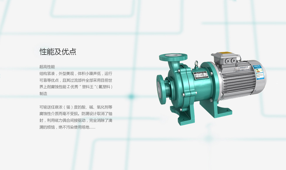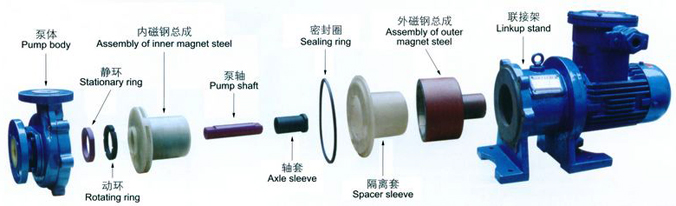 驅(qū)動裝置采用主動磁鐵聯(lián)軸器直接裝在電機軸上,泵室完全封閉,通過磁力偶合間接驅(qū)動泵軸上帶磁鐵的葉輪旋轉(zhuǎn)結(jié)構(gòu)緊湊、安全節(jié)能。堅固耐用的泵體結(jié)構(gòu)雖然接觸液體部分是氟塑料,但泵外殼是金屬材料,故泵體足以承受管道的重量及抵受機械性沖擊,氟塑料磁力泵由泵、磁力傳動器、電動機三部分組成。關(guān)鍵部件磁力傳動器由外磁轉(zhuǎn)子、內(nèi)磁轉(zhuǎn)子及不導磁的隔離套組成。當電動機帶動外磁轉(zhuǎn)子旋轉(zhuǎn)時,磁場能穿透空氣隙和非磁性物質(zhì),帶動與葉輪相連的內(nèi)磁轉(zhuǎn)子作同步旋轉(zhuǎn),實現(xiàn)動力的無接觸傳遞,將動密封轉(zhuǎn)化為靜密封。由于泵軸、內(nèi)磁轉(zhuǎn)子被泵體、隔離套完全封閉,從而徹底解決了“跑、冒、滴、漏”問題,消除了煉油化工行業(yè)易燃、易爆、有毒、有害介質(zhì)通過泵密封泄漏的安全隱患,有力地保證了職工的身心健康和安全生產(chǎn)。