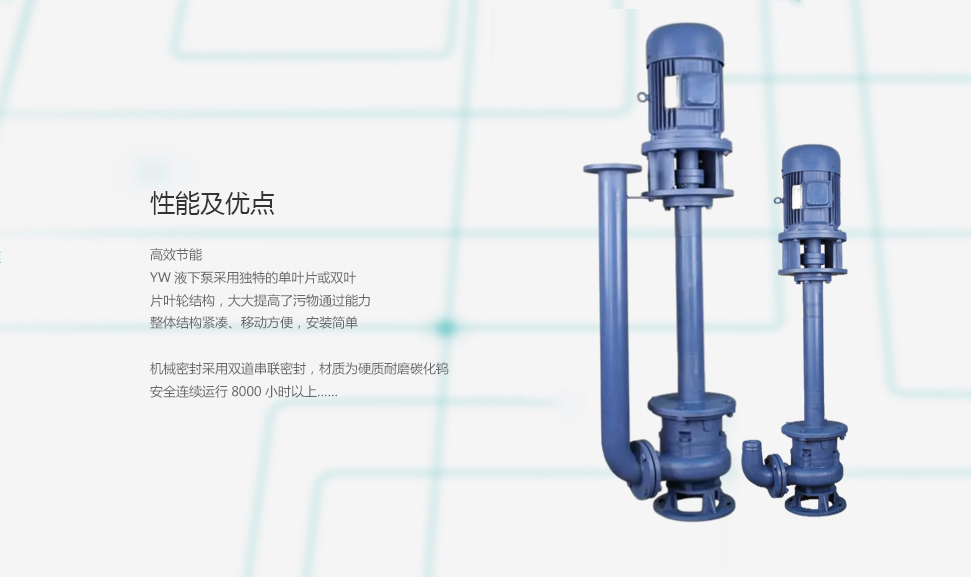 YW雙管液下污水泵是在引進國外先進技術的基礎上,結合國內水泵的使用特點而研制成功的新一代泵類產品,具有節能效果顯著、紡纏繞、無堵塞、自動安裝和自動控制等特點。在排送固體顆粒和長纖維垃圾方面,具有獨特效果